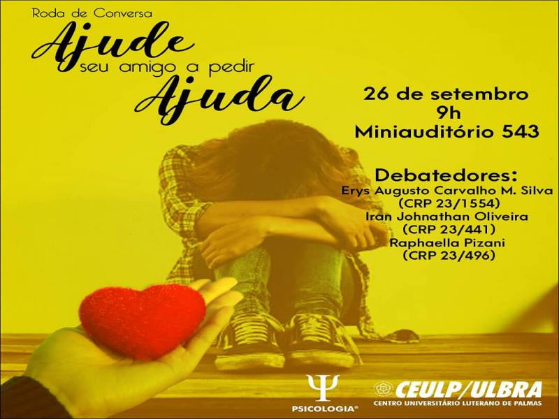 A campanha Setembro Amarelo que anualmente mobiliza o país em favor da conscientização e prevenção ao suicídio, está quase chegando ao fim. Mas antes que acabe, o curso de Psicologia do Centro Universitário Luterano de Palmas quer entregar mais uma parcela de contribuição a este importante debate. No dia 26 de setembro, às 9h, no miniauditório 543 do Ceulp, ocorrerá a roda de conversa "Ajude seu amigo a pedir ajuda".