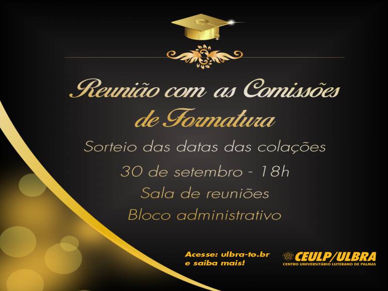 O Centro Universitário Luterano de Palmas -- Ceulp/Ulbra informa a todos os concluintes do segundo semestre de 2019 que haverá reunião com as comissões no dia 30 de setembro, às 18h, na sala de reuniões (localizado no prédio administrativo).