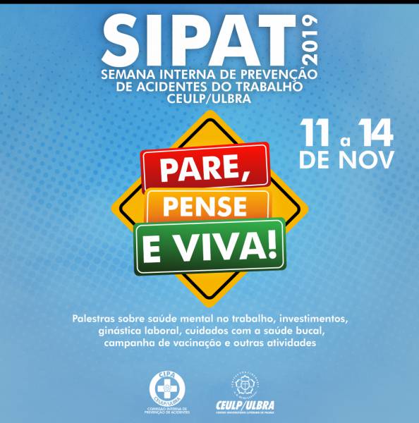 O tema para a SIPAT desse ano do Ceulp/Ulbra é "Pare, pensa e viva". Todos os colaboradores são convidados a participar. Para as palestras nos dias 13 e 14 deverá ser realizada a divisão dos grupos dos setores, com o propósito de não prejudicar o funcionamento dos trabalhos.